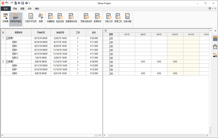 Edraw Project可以根據(jù)甘特圖內(nèi)容,輸出各類報(bào)告圖表,方便我們進(jìn)一步了解任務(wù)的資源成本、資源工時(shí)以及進(jìn)度是否在可控的范圍。