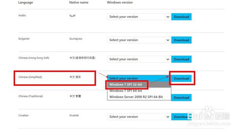 2、下拉選擇中文簡(jiǎn)體,選擇你的系統(tǒng)版本,然后點(diǎn)擊download下載!系統(tǒng)版本主要有32bit和64bit,怎么看自己的系統(tǒng)版本請(qǐng)參考第3步!