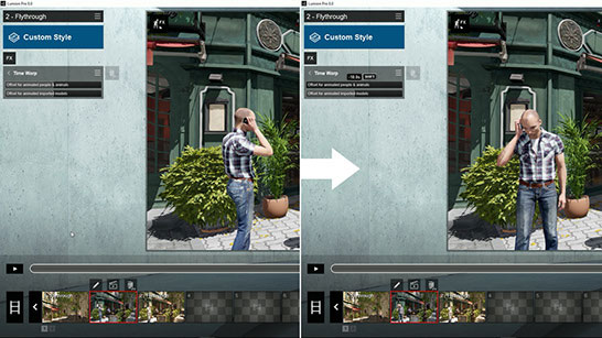 一只海鷗在錯(cuò)誤的時(shí)刻飛過(guò),一個(gè)動(dòng)畫(huà)人的手臂神秘地撞到了大樓的正面。使用 Lumion 8 的新時(shí)間扭曲效果,您可以用時(shí)間偏移來(lái)改變動(dòng)畫(huà)人物、動(dòng)物和對(duì)象的小動(dòng)作。向后或向前切換時(shí)間。您的動(dòng)畫(huà)對(duì)象現(xiàn)在會(huì)調(diào)整其位置,以在正確的時(shí)間準(zhǔn)確地?cái)[出正確的姿勢(shì)。