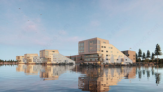 模型放置完成后,光影效果Lumion會(huì)自動(dòng)進(jìn)行添加,我們只需要對(duì)建筑增加材質(zhì),即可非常快速的獲得效果圖。