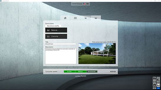 在 Lumion 8 中,新的和改進(jìn)的保存屏幕和對(duì)話(huà)框功能讓您更容易組織您的場(chǎng)景文件到正確的文件夾中。檢索或更新您的項(xiàng)目時(shí)確保您的文件存儲(chǔ)在您想要的地方,無(wú)論是在您的計(jì)算機(jī)上還是在網(wǎng)絡(luò)上。