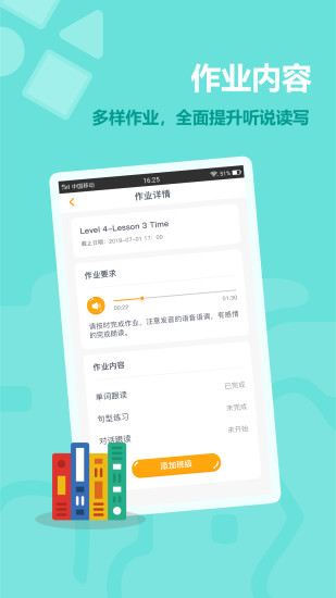 作業(yè)接收教師布置的作業(yè),通過線上答題、跟讀等多種形式,有效鞏固課堂所學(xué)知識(shí)。