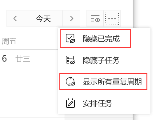 打開主應用,切換到日歷視圖界面,點擊列表頁右邊點點點,然后選擇隱藏已完成,顯示未來周期即可。
