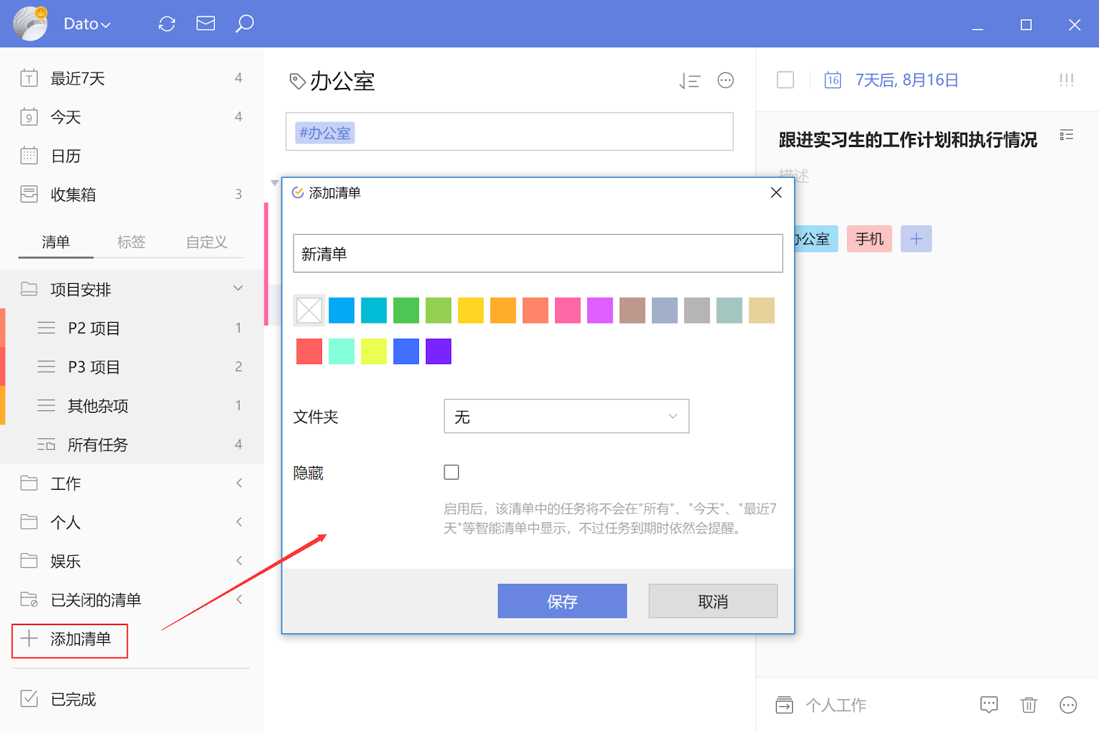 點擊左側(cè)邊欄的【添加清單】按鈕,在彈窗中輸入清單名稱、設置顏色、清單所屬文件夾以及是否隱藏,點擊【保存】即可完成創(chuàng)建。