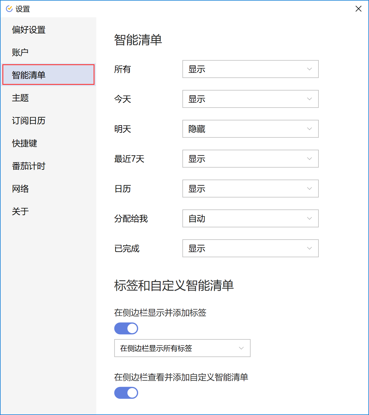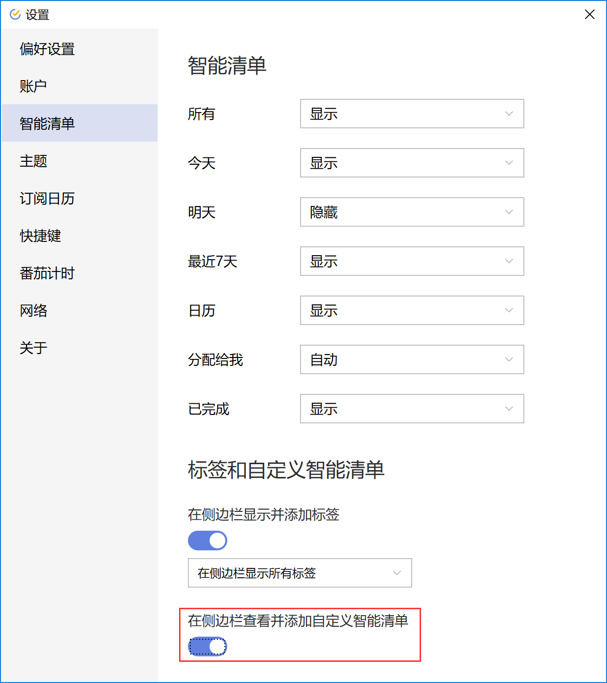 在【設置】-【智能清單】中開啟【自定義智能清單】,在左側(cè)邊欄的【清單】和【標簽】旁邊會出現(xiàn)【自定義】。