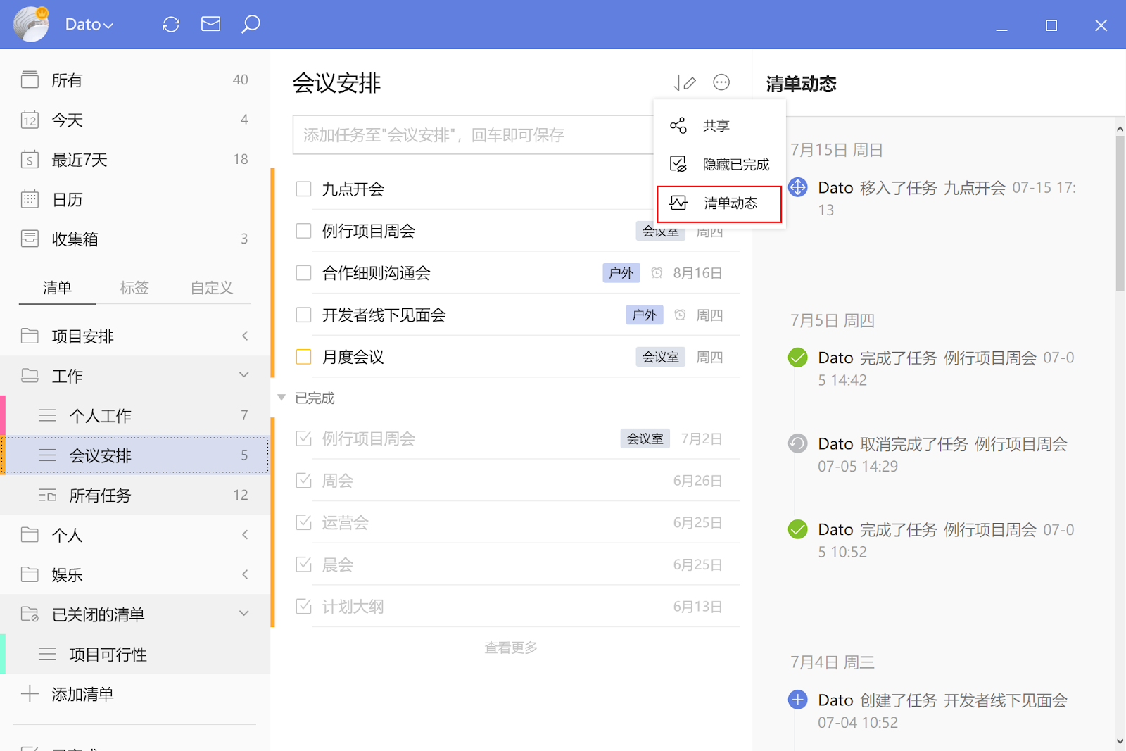 選擇一個清單,點擊任務界面上方的「···」圖標,然后選擇【清單動態(tài)】,即可在右側(cè)看見此清單的全部動態(tài),包括添加、刪除、移動、完成任務等相關操作。