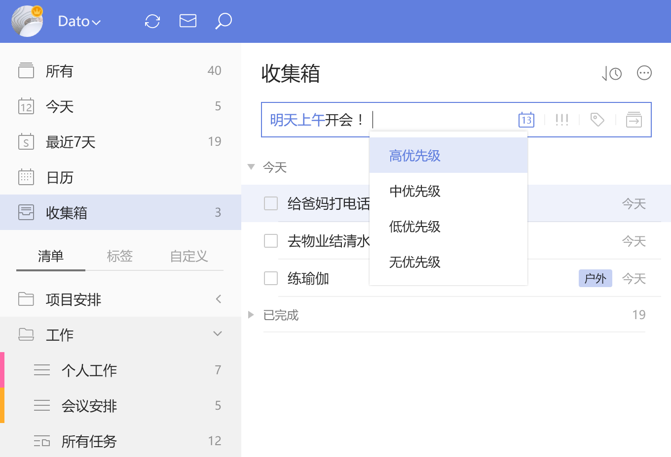 智能識別日期:在輸入欄內(nèi)輸入任務,文本中的日期和時間顯示高亮,將自動為任務設定到期日和提醒時間。