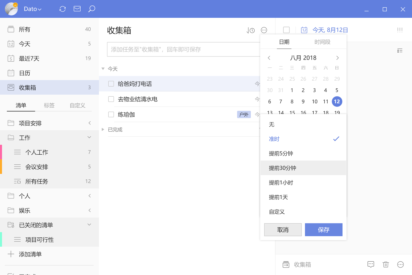若您在創(chuàng)建任務的時候并未輸入任務到期時間,那么您可以點擊任務進入右側(cè)詳情頁,單擊日期欄為任務設置到期時間。 設置好到期時間后,可以為任務設置提醒。