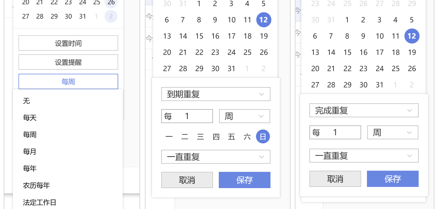 支持【每天】、【每周】、【每月】、【每年】、【農(nóng)歷每年】重復;點擊自定義, 可以更為個性化的設置重復,例如【每周二】或【每個月的第三個周五】。 目前支持【到期重復】和【完成重復】兩種重復模式。