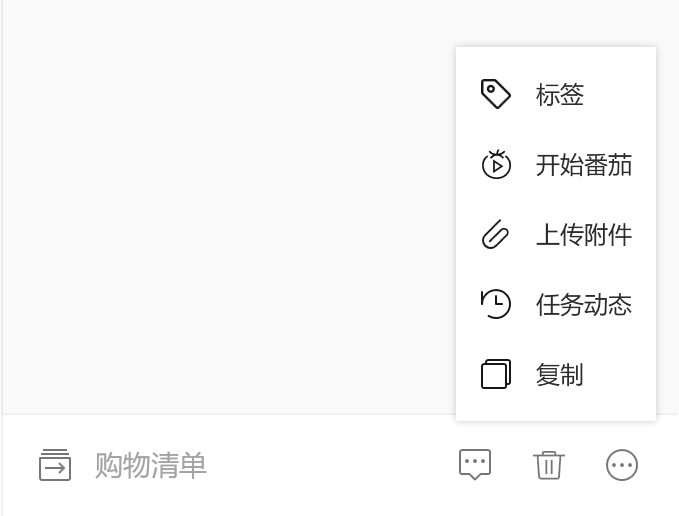 【更多】中包括: 1、【標簽】:為當前任務添加標簽 2、【開始番茄】:打開番茄計時,并開始專注 2、【上傳附件】:滴答清單支持上傳相冊中的照片,音頻和經(jīng)常使用的文件類型如 word,excel 等。