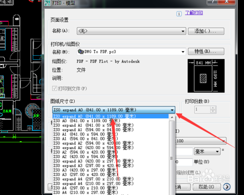 4、在打印機/繪圖儀名稱選擇三角符號,選擇PDF.pc3類型。