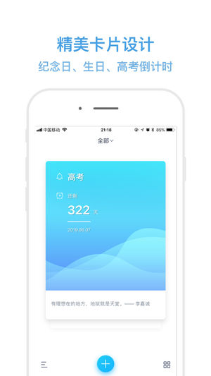 基本的節(jié)點記錄功能外,還有天數(shù)計算、日期推算等相關(guān)功能。還可以生成精美圖片,多渠道多方式轉(zhuǎn)發(fā)分享,是一款簡潔美觀、小巧實用的日期管理app。