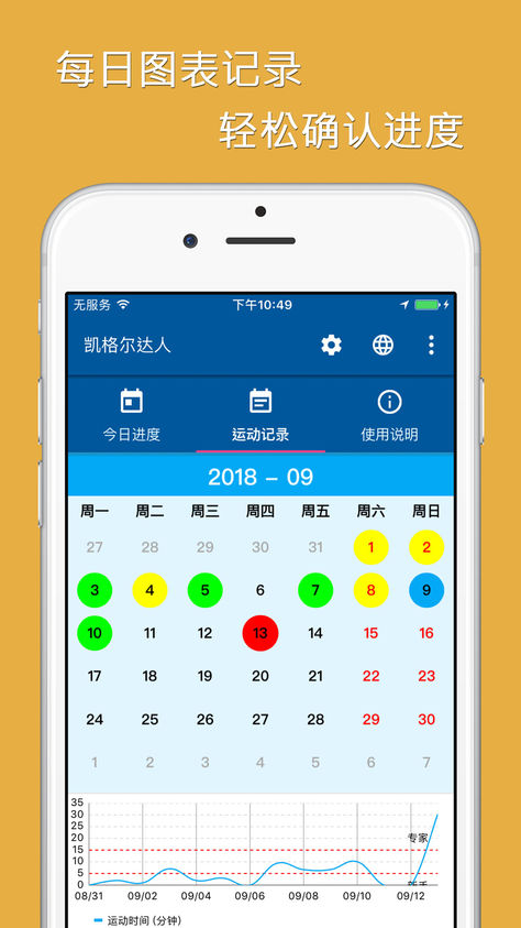 * 有運(yùn)動(dòng)記錄的日期會(huì)用顏色顯示:綠色-該日運(yùn)動(dòng)三次以上;黃色-運(yùn)動(dòng)低于三次;紅色-今日運(yùn)動(dòng)記錄;