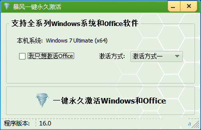 2、暴風激活工具一鍵永久激活win7系統(tǒng),win8系統(tǒng),win8.1系統(tǒng),win10系統(tǒng)和各系列的Office軟件的激活問題,輕松 一鍵就可以實現(xiàn)永久完美離線激活,完全超越其他任何激活工具.