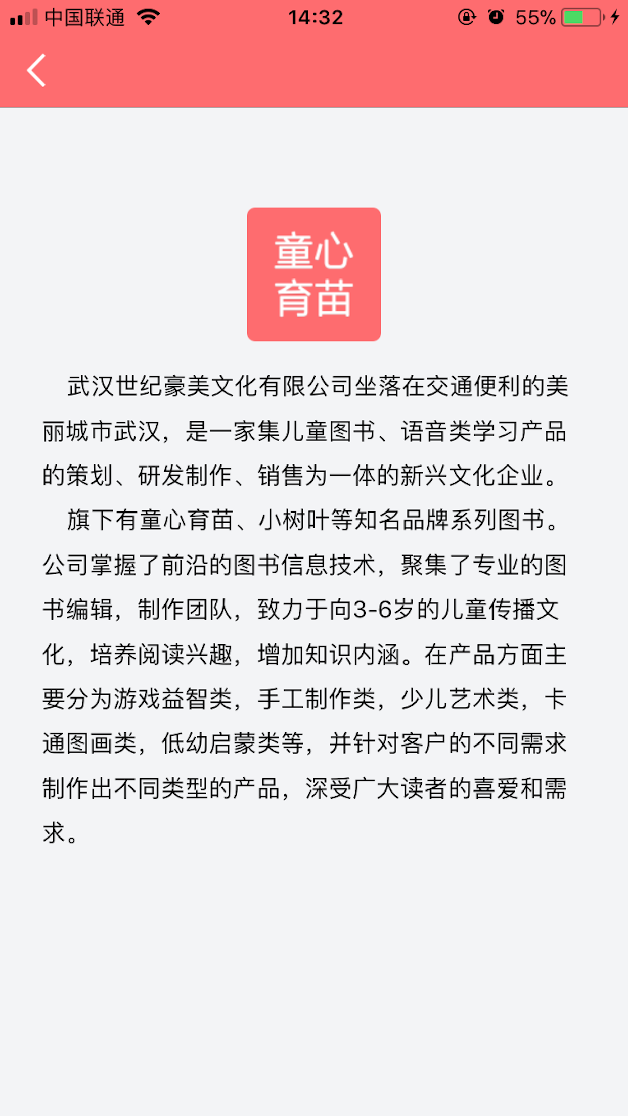 武漢世紀(jì)豪美文化有限公司坐落在交通便利的美麗城市武漢,是一家集兒童圖書、語音類學(xué)習(xí)產(chǎn)品的策劃、研發(fā)制作、銷售為一體的新興文化企業(yè)。旗下有童心育苗、小樹葉等知名品牌系列圖書。