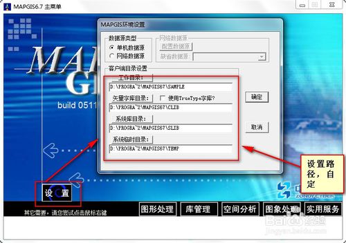 軟件就成功安裝完成了,現(xiàn)在打開mapgis,打開主窗口。點(diǎn)擊【設(shè)置】,修改存儲路徑,也可以使用默認(rèn),如圖