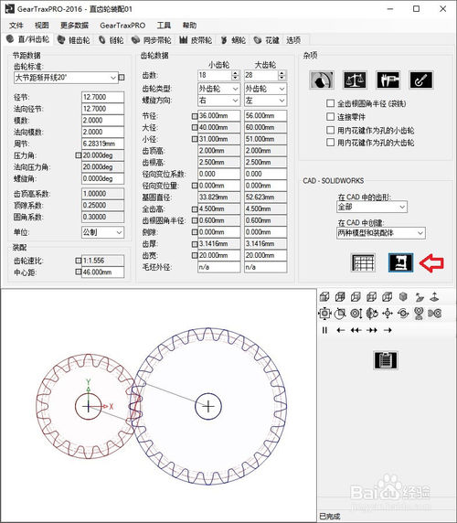 如圖,對各種參數(shù)進(jìn)行設(shè)置后,點擊紅色箭頭處按鈕,即可在Solidworks中自動生成模型。