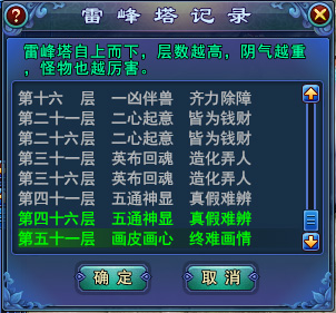 玩家可每隔五層保存記錄,下次則可直接進入該層雷峰塔。(玩家升級后,可自動記錄低于自己等級的層數(shù)。)