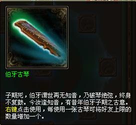 雷峰塔中的怪物有一定幾率掉落道具“伯牙古琴”。使用后可將好友數(shù)量上限增加1個,最多可把好友數(shù)上限增加到200個。