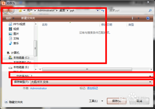 在打開的另存為對話框中,選擇保存位置和文件名,選擇保存類型為“大綱/rtf文件”、完成后單擊保存