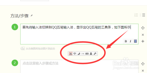 首先將輸入法切換到QQ五筆輸入法,顯示出QQ五筆的工具條,如圖所示