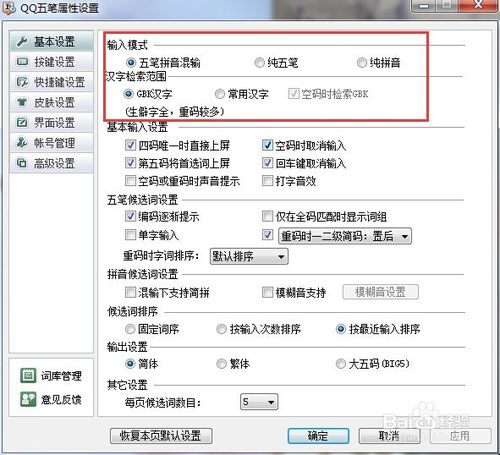 四、可以對(duì)QQ五筆輸入的一些基本屬性進(jìn)行設(shè)置。