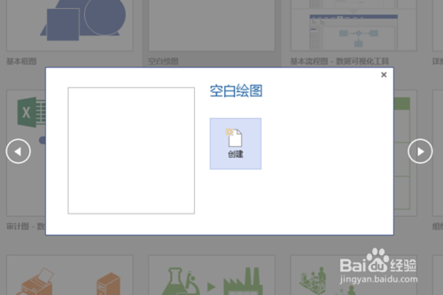 第一步,打開電腦中的Visio,然后點(diǎn)擊空白繪圖,再在彈框中點(diǎn)擊創(chuàng)建(如果此時(shí)你想創(chuàng)建其他類型繪圖,可以點(diǎn)擊左右箭頭按鈕進(jìn)行選擇),如下圖所示