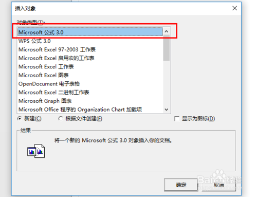 第三步,在彈框中選擇【Microsoft公式3.0】,然后點(diǎn)擊確定按鈕,如下圖所示: