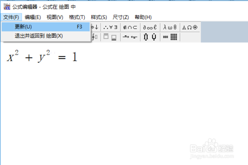 第六步,公式編輯完成后,點(diǎn)擊【文件】菜單,然后點(diǎn)擊更新(或者直接按F3鍵),接著關(guān)閉公式編輯器界面,如下圖所示: