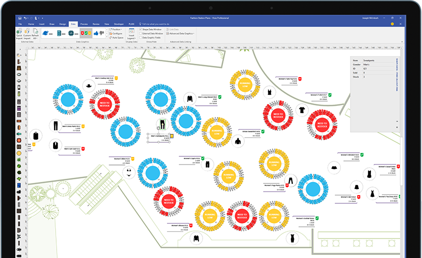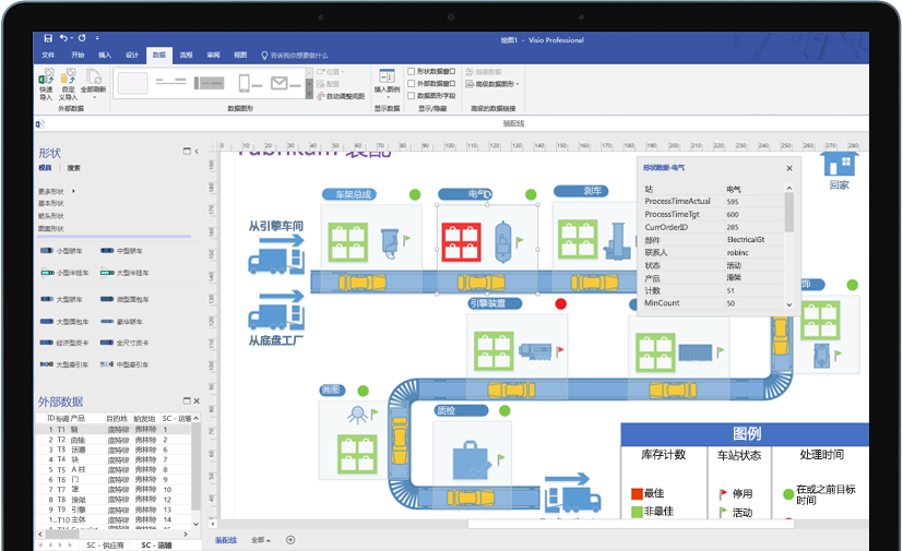 使用實(shí)際可視化對(duì)象傳達(dá)實(shí)時(shí)數(shù)據(jù)。在 Visio 中或者利用 Office 365* 應(yīng)用和服務(wù),將形狀和圖表鏈接到常用源文件,并通過應(yīng)用的形狀格式設(shè)置,自動(dòng)更新以反映基礎(chǔ)數(shù)據(jù)更改。