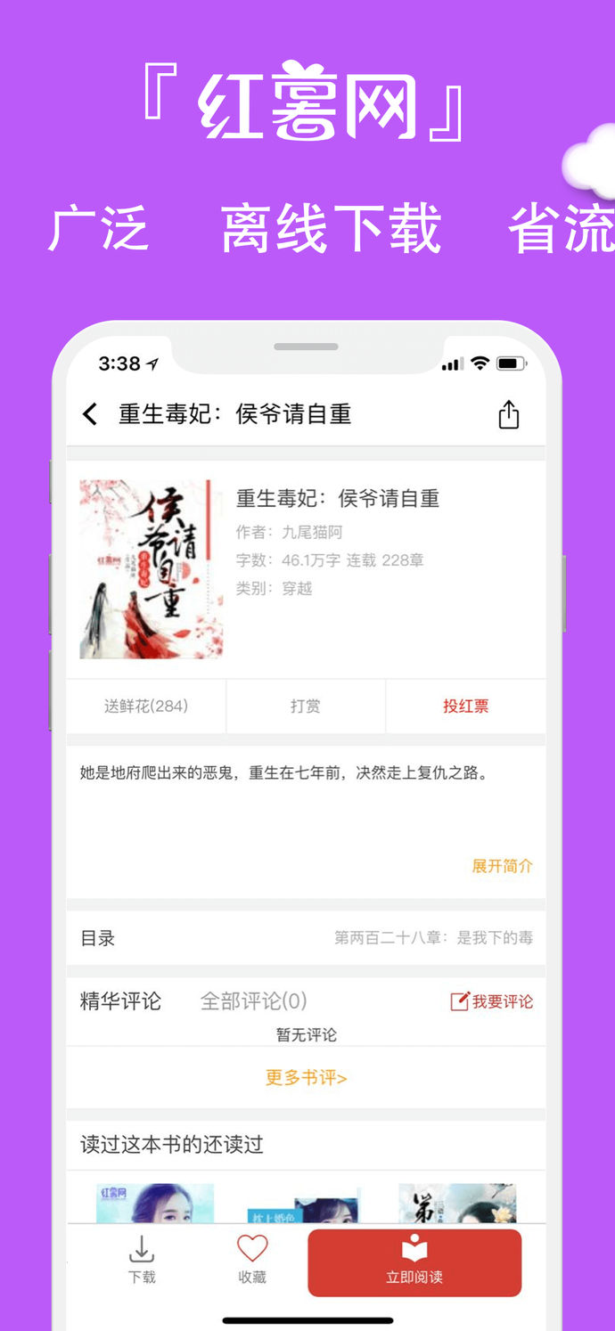 獨有下載功能公眾章節(jié)和VIP章節(jié)都能下載,隨時隨地都可以追書,有wifi的時候一次性下載,省流量;
