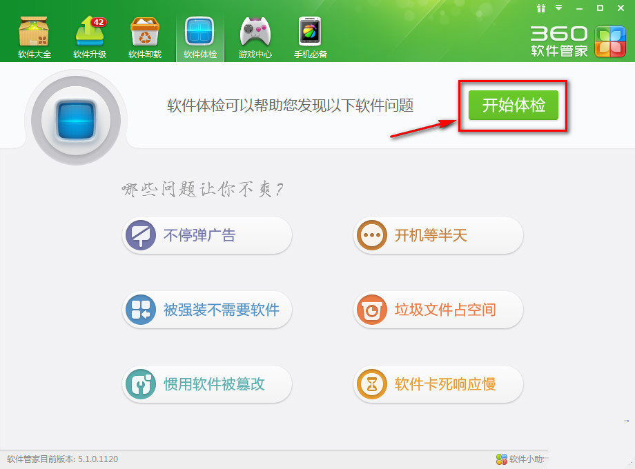 2.在“軟件體檢”界面點(diǎn)擊“開(kāi)始體檢”按鈕開(kāi)始對(duì)您的電腦中安裝的軟件進(jìn)行體檢,