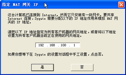 如圖所示選擇的是服務(wù)器客戶端模式,單擊“確定”按鈕,出現(xiàn)圖二所示的網(wǎng)絡(luò)診斷窗口,軟件提示網(wǎng)絡(luò)的診斷已經(jīng)完成,單擊“確定”按鈕,出現(xiàn)圖三所示的指定NAT網(wǎng)關(guān)IP的窗口,系統(tǒng)已經(jīng)為本機(jī)分配了一個(gè)IP地址為192.168.0.1的內(nèi)部IP地址,并將其設(shè)置為其他機(jī)器的網(wǎng)關(guān)地址