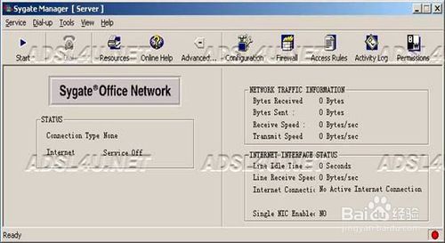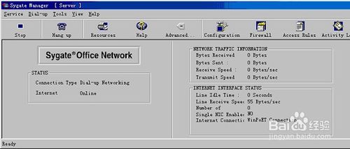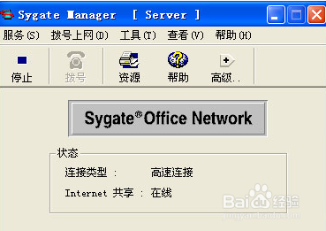安裝好的Sygate服務(wù)器端程序,在系統(tǒng)的通知去區(qū)域雙擊e圖標(biāo),出現(xiàn)Sygate服務(wù)器程序的主窗口,顯示如圖所示,程序服務(wù)器已經(jīng)正常運(yùn)行,如果要將服務(wù)中斷,選擇‘服務(wù)’‘停止’項(xiàng)即可