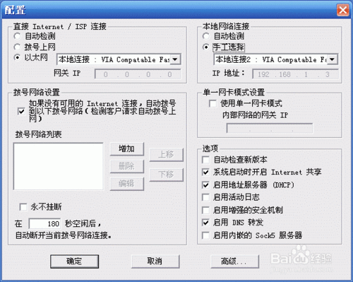 Sygate作為一個(gè)網(wǎng)關(guān)型代理服務(wù)器,具有站點(diǎn)的訪問控制,指定允許和過濾IP、DHCP、動(dòng)態(tài)IP分配,記錄日記、防火墻安全保護(hù)等功能,并且支持二次代理。單擊工具欄上的‘配制’按鈕,在彈出的如圖所示的窗口中設(shè)置、記錄日志,自動(dòng)撥號(hào),安全性等