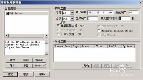 在出現(xiàn)下圖的窗口時(shí),單擊“增加”按鈕,添加一條新的訪問規(guī)則,按“刪除”按鈕,可以刪除該規(guī)則,選擇一條規(guī)則,按“重命名”按鈕,為其改名,如果用戶要添加新的規(guī)則,在對(duì)應(yīng)的右邊窗口中,設(shè)置初始連接的方向、協(xié)議、端口等信息,在選項(xiàng)區(qū)域中設(shè)置服務(wù)模式,在后繼連接區(qū)域中設(shè)置后連接的相關(guān)信息
