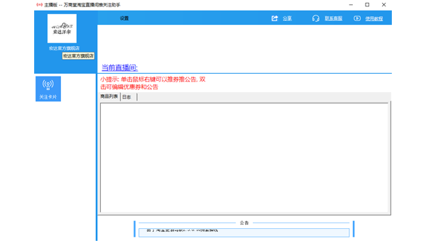 萬商堂淘寶直播間推關(guān)注助手是一款很不錯(cuò)的淘寶推廣工具,這款軟件主要是幫助用戶自動(dòng)推送關(guān)注,從而提升店鋪的關(guān)注度,讓更多人了解店鋪的商品,提升業(yè)績。
