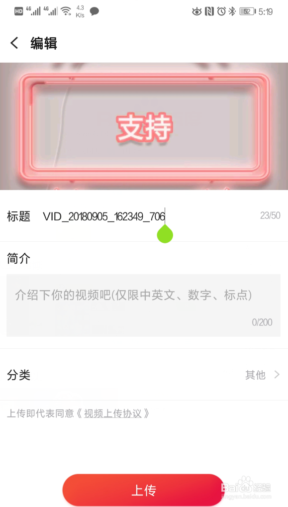 選擇完畢后,我們更改視頻的標(biāo)題以及視頻的簡(jiǎn)介信息,然后點(diǎn)擊底部的“上傳”選項(xiàng)。