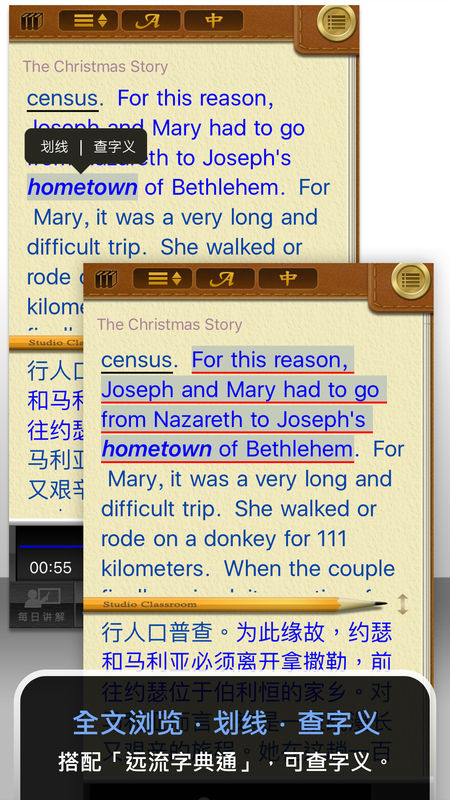 4.可查看中文翻譯,并提供英/中同步閱讀,以訓(xùn)練聽、讀、譯能力。