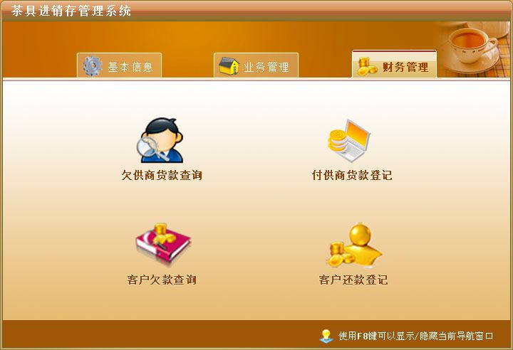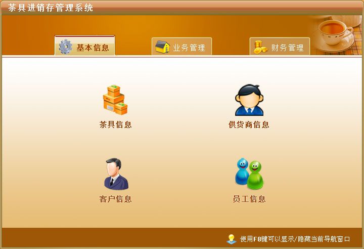 茶具進(jìn)銷存管理系統(tǒng)是一款針對茶具公司和茶葉店對茶具的出庫入庫進(jìn)行管理。軟件涵蓋了茶具信息,員工信息,客戶信息,供貨商信息,入庫管理,銷售管理,庫存查看,欠款登記,欠款查詢,還款登記,還款查詢。軟件操作簡單,功能全面,一目了然,容易上手,本系統(tǒng)界面更加友好,操作更加人性化,使用更加方便,讓您的工作更加得心應(yīng)手;更加完善的票據(jù)管理,靈活的功能設(shè)置等,讓您在使用過程中適合更多使用情況;