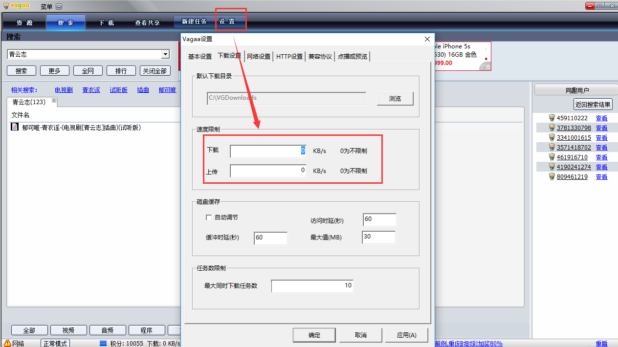 打開vagaa軟件,點擊【設置】,然后在彈出的對話框的【下載設置】欄中的速度限制下填寫下載上傳的速度值,點擊【確定】即可。