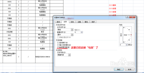 4、選第二個(gè)選項(xiàng)“對(duì)齊”命令,如下圖,在“合并單元格”命令這一欄我們發(fā)現(xiàn)已經(jīng)被勾選,所以Excel中的三個(gè)單元格就被合并為一個(gè)了,我們?nèi)サ舭压催x去掉,如下圖,點(diǎn)擊確定