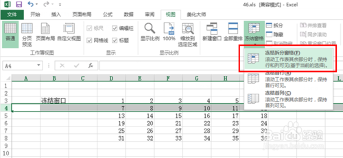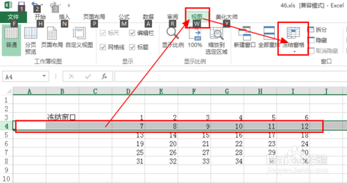 2、接著,我們選擇好我們想“凍結(jié)”的行或者列,首先,我們“凍結(jié)”第四行試試,選定第四行,點(diǎn)擊“視圖”,就看到“凍結(jié)窗口”了。如圖