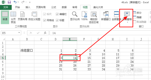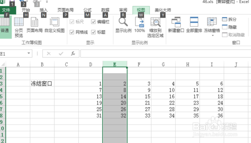 4、接著,我們還原上面的?!皟鼋Y(jié)”某一列試試。選擇某一列,點(diǎn)擊“視圖”,就看到“凍結(jié)窗口”,選擇“凍結(jié)拆分窗格”即可。如圖: