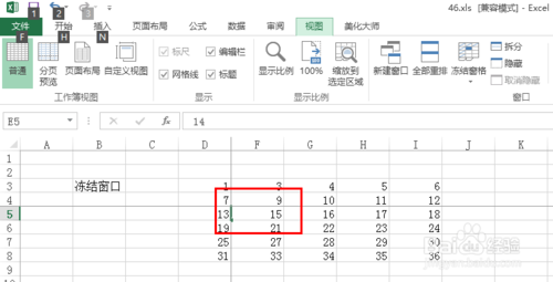 5、最后,我們看看另一個(gè)。我們還是還原上面的,只選擇一個(gè)單元格,例如,我們選擇“E5”,然后再“凍結(jié)”,如圖