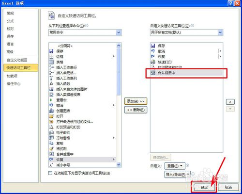 最后點(diǎn)確定,“合并后居中”這一按鈕就添加到“快速訪問(wèn)工具欄”了