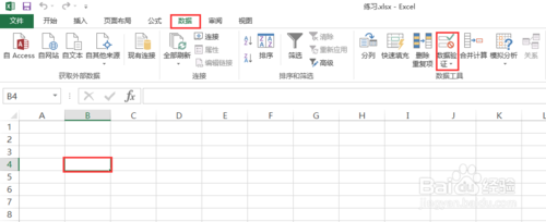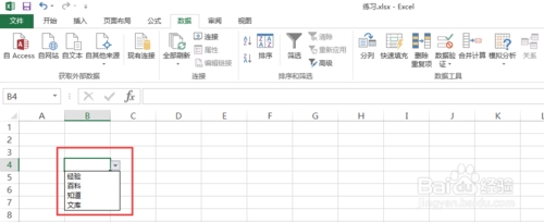 1、選定需要建立下來(lái)菜單的單元格,例如B4單元格,選擇“數(shù)據(jù)”選項(xiàng)卡,單擊“數(shù)據(jù)工具”組中的“數(shù)據(jù)驗(yàn)證”按鈕