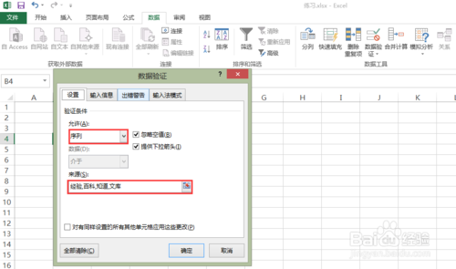 3、在“允許”下拉列表框選擇“序列”選項(xiàng),并且勾選“提供下拉箭頭”復(fù)選框(默認(rèn)勾選)在“來(lái)源”文本框中輸入下拉選項(xiàng),例如:經(jīng)驗(yàn)、百科、知道、文庫(kù),每個(gè)選項(xiàng)要半角英文逗號(hào)隔開(kāi)。