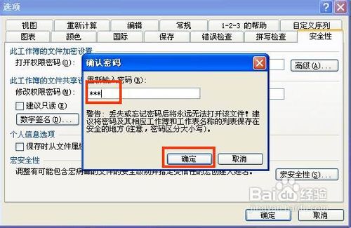 4、點(diǎn)擊安全性按鈕以后,選項(xiàng)窗口進(jìn)入安全性設(shè)置窗口,在安全性設(shè)置窗口上面的次工作本的文件加密設(shè)置選項(xiàng)下設(shè)置好打開(kāi)權(quán)限密碼,然后點(diǎn)擊窗口左下角的確定按鈕