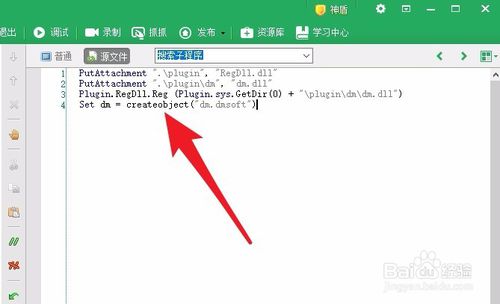 5、打開腳本編輯器,輸入圖中的內(nèi)容并運(yùn)行即可完成大漠插件的注冊(cè)。